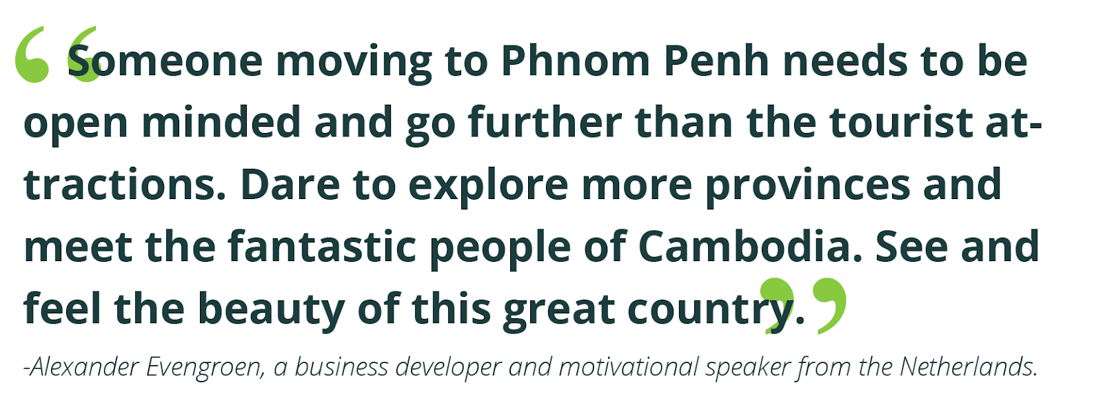 We’ll take you on a complete tour with this guide, include quotes from long-time expats, and even give you some Khmer phrases to go with each section.